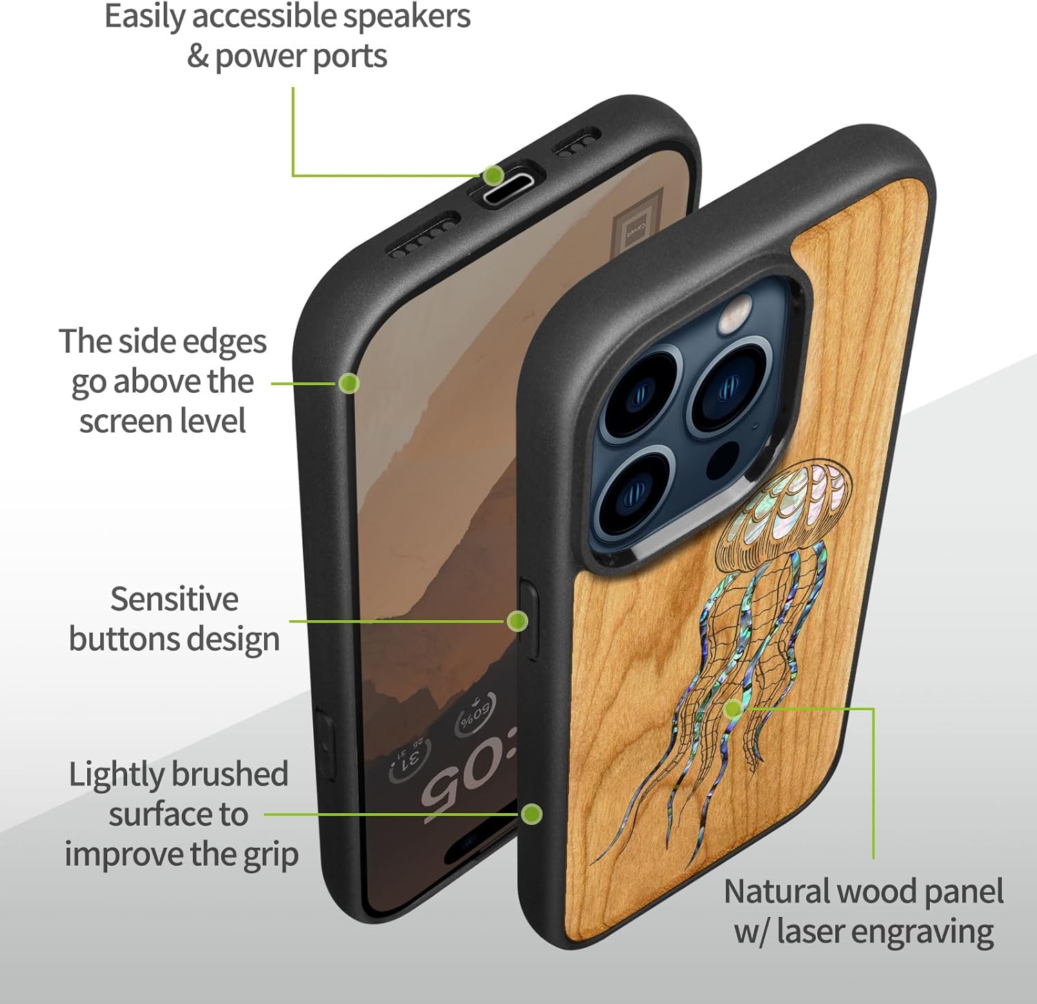 | Additional Features | Natural solid wood back panel and laser engraving, The unique solid wood keeps the palm dry and prevents fingerprints from sticking to the surface of the case, keeping it clean and elegant |