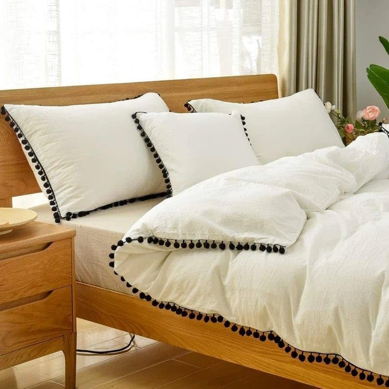 White Duvet Cover With Black Pom Pom 100% Cotton Solid Duvet Cover 3 Pcs Set, Made from pre-washed, Pre-shrunk finest quality Cotton, this duvet cover set will add coziness to your bedroom and guarantee a good night's sleep. Cotton bedding is lightweight, breathable, thermoregulation and moisture-wicking, which translated to comfort all year round. - - - - - - - - - - - - - - - - - - - - - - - - - - - - - SET INCLUDES: 1 Duvet Cover, 2 Pillow Cover - - - - - - - - - - - - - - - - - - - - - - - - - - - - - Note: Actual Product may differ slightly in color than the photographs depending upon the screen resolution.